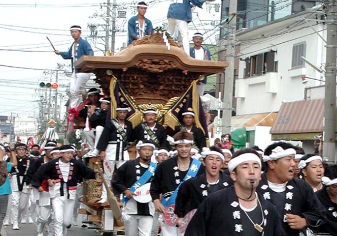 年に一度の 秋祭り 自慢の地車(だんじり) 曳きまわす
